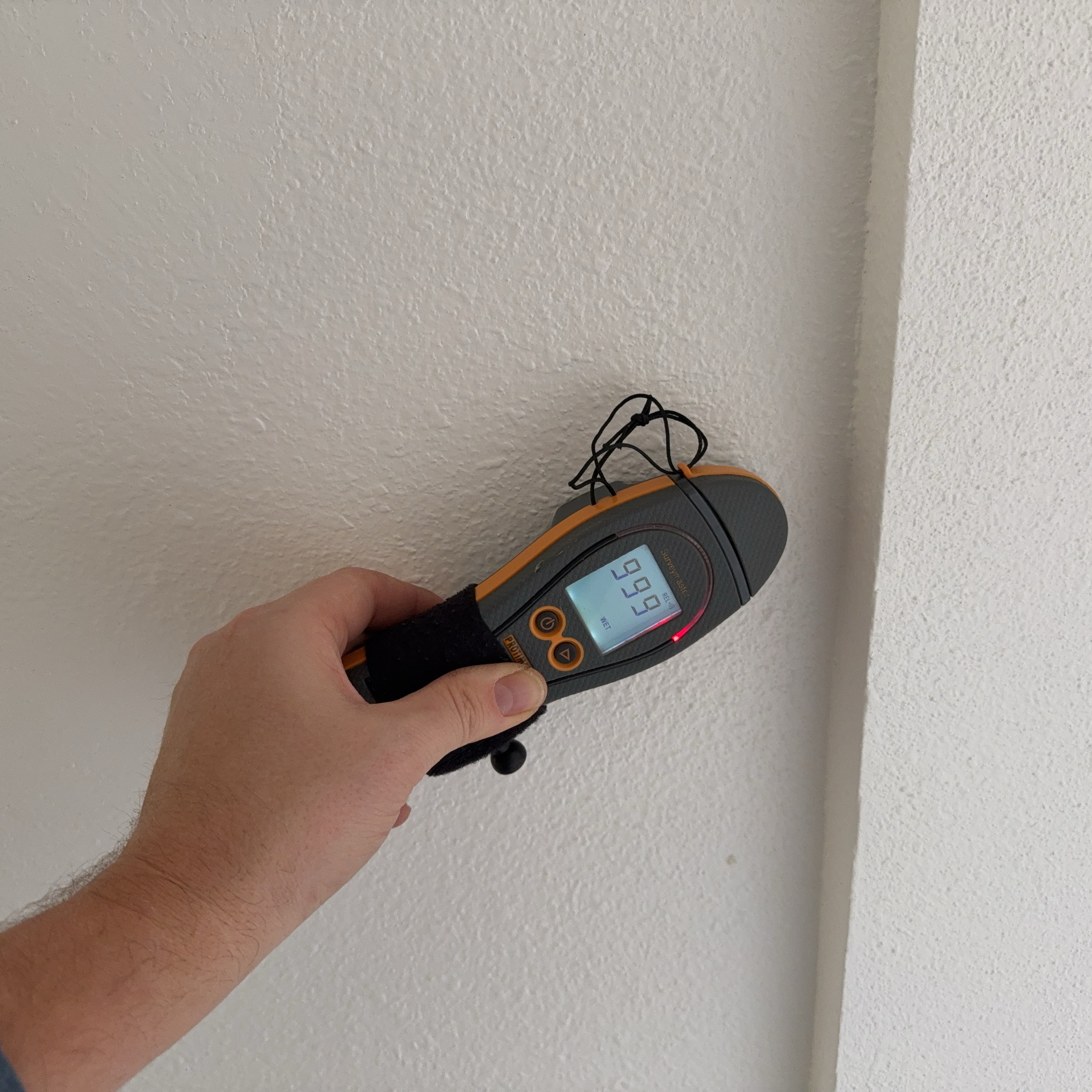 The thermal image above reveals a temperature difference, likely indicating water intrusion. In the photo below, a moisture meter is used to confirm the presence of moisture in a suspected area.